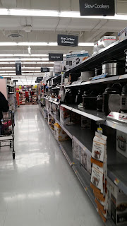 Instead, they got blue stripes and product pictures. It's kinda reminiscent of an early version of the squiggles décor, with thick, straight stripes instead of thin squiggles. This end of the store also appears to still have the original aisle markers.